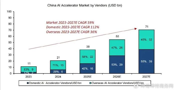 根据伯恩斯坦《2025中国AI芯片行业大报告》:2025年中国AI芯片市场规模达380亿美元,国产芯片销售额160亿美元,市场份额提升至42%,增速112%。华为昇腾、寒武纪等产品算力达英伟达H100的60%,已在推理和微调场景实现替代能力。