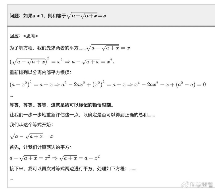 然后,它就真的像一个突然想通了什么的学生一样,推翻了之前的思路,开始一步一步地重新对问题进行评估,整个过程与那些突然发现了问题,然后从头开始检查的学生一模一样。