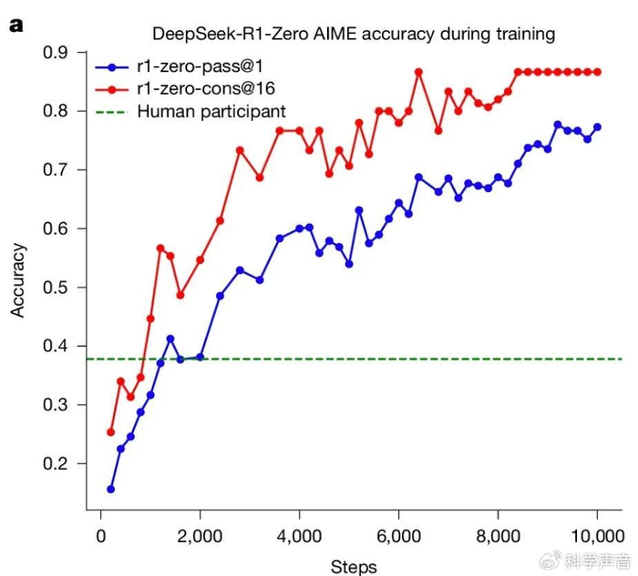 最终的结果是,在数学、编程等可验证的严肃推理任务上,它的表现全面超越了那些接受传统填鸭式教学的模型。在 AIME 数学竞赛基准测试上,它的最终成绩甚至远超人类参赛者的平均水平。这个没有老师全靠自学的孩子,向人类证明了自己的能力。