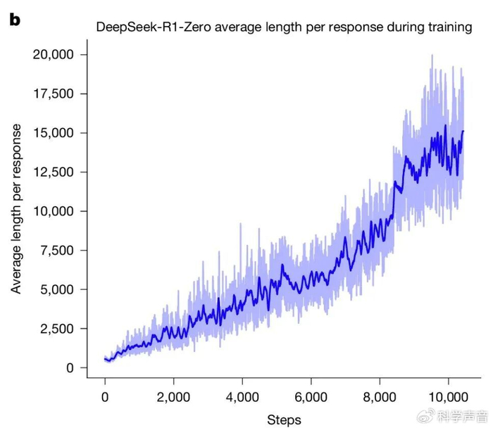 科学家发现,随着训练的进行,模型生成的回答文本长度在持续、稳定地暴涨。这说明,在没有任何外部指令的情况下,AI 自己领悟了一件事:那就是简单粗暴解决不了复杂问题,花更多的时间去推演和探索有助于获得正确答案。于是,它不再追求一口吃个胖子,而是自发地选择了深度思考这条路线。