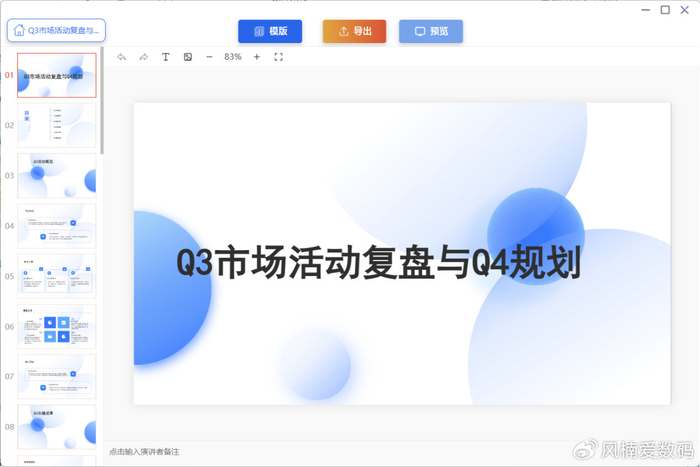 • 体验:我打开它的“AI PPT”功能,输入主题“Q3市场活动复盘与Q4规划”,并选择了一个商务模板。