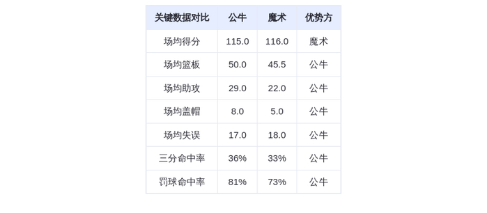 从赛季数据来看,公牛在篮板(50.0)、助攻(29.0)和盖帽(8.0)方面占据优势,尤其是防守篮板(38.0)排名联盟第7。魔术则在罚球数(36.0)和进攻效率方面稍占上风,但场均失误高达18次,排名联盟第3多。