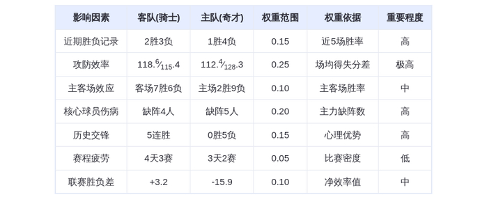 骑士在三分出手(44次联盟第1)、进攻篮板(12.7个第6)和盖帽(5.6次第5)等关键数据全面占优,而奇才除了三分命中率(36%联盟第7)外,失误(16.2次)和抢断(7.0次)均为联盟最差水平。骑士场均净胜分+3.2,奇才则为-15.9,形成鲜明对比。