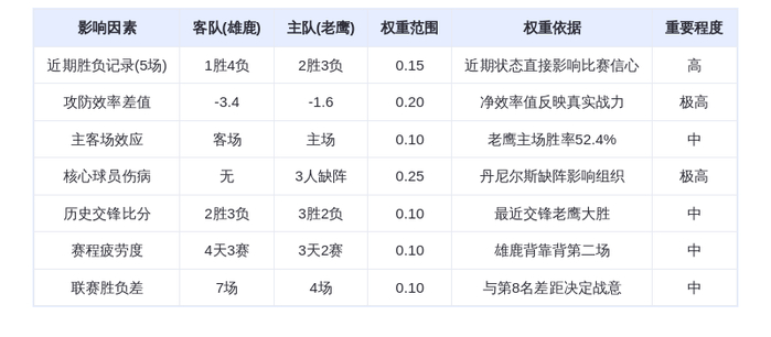 综合分析攻防效率、伤病情况及主客场因素,尽管老鹰坐镇主场,但雄鹿在字母哥带领下有望终结连败。